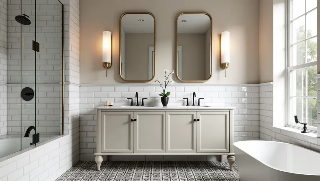 Make it feel like a spa. Geometric floor tiles, vanities that look like furniture pieces, frosted glass sconces flanking mirrors. Subway tiles work great here too, especially with contrasting grout that creates pattern without being busy.