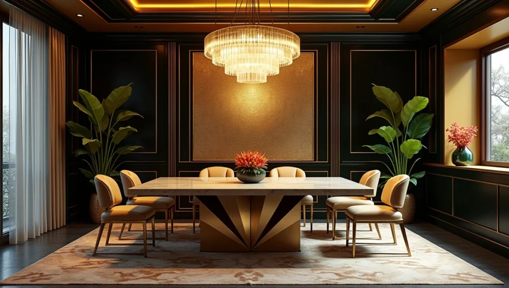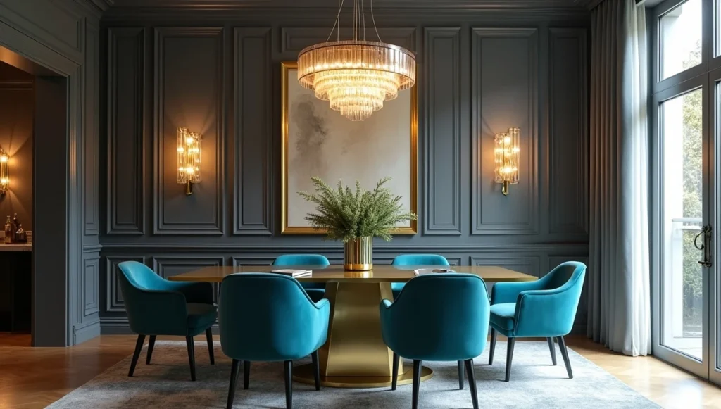 Dining rooms are where you can really go for it. Tables with geometric metal bases, dramatic lighting, maybe some metallic wallpaper if you’re feeling bold. This is the one room where “too much” is almost impossible.