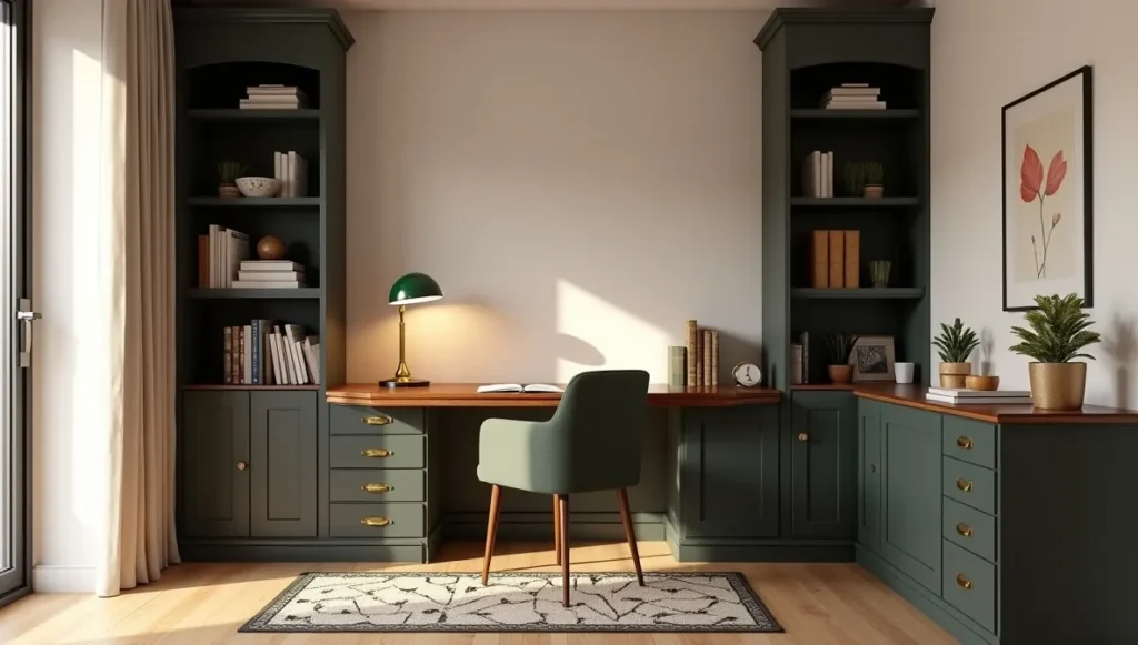 Your workspace should feel important and inspiring. Look for desks with geometric bases – dark wood with brass accents works great. Those classic brass banker’s lamps with green glass shades are perfect for task lighting while staying true to the style. Built-in bookshelves with brass hardware make the whole space feel more substantial.