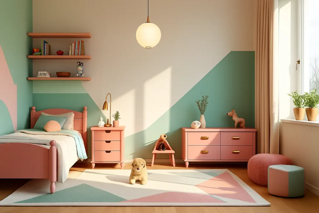 Here’s where people think Art Deco won’t work, but I’ve done some amazing children’s spaces with this style. The trick is adapting it – use softer geometric patterns in playful colors like mint green with gold or coral with brass. Safety first though – rounded corners on furniture and sturdy materials. Geometric area rugs are perfect for play areas, and pendant lights that cast fun shadow patterns on the ceiling make great nightlights.