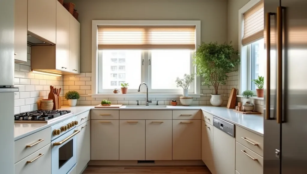 Kitchens are tricky because you need modern function with vintage style. Focus on cabinet hardware – geometric pulls in brass or chrome make a huge difference. For backsplashes, try subway tiles in herringbone patterns with dark grout.