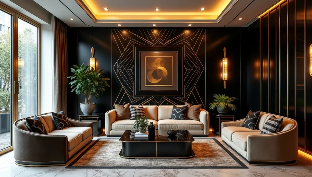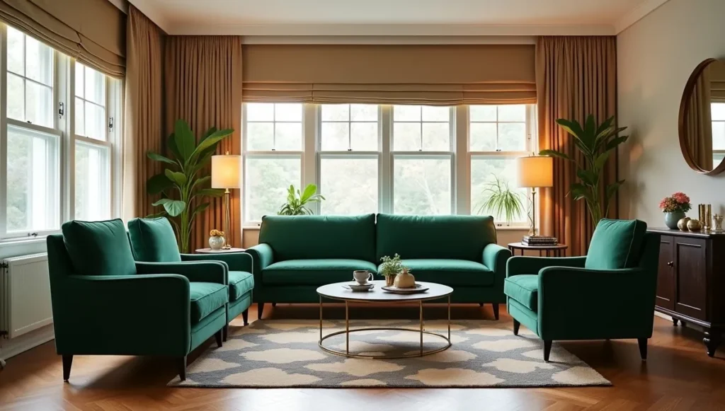 Start with your sofa – look for angular arms in rich velvet. Build around it with a coffee table that has brass or chrome legs. Skip the big sectional and create smaller conversation areas instead. Art Deco works better with intimate groupings. And please, no fancy curtains. Clean Roman shades or simple panels work so much better.