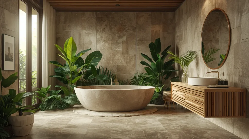This is where you can really go wild with the spa vibes. Natural stone tiles, bamboo vanity, plants everywhere (if you’ve got good ventilation – and you better, with all those plants). I’ve done some bathrooms with freestanding tubs surrounded by greenery that make clients feel like they’re bathing in a jungle stream. Sounds cheesy, but trust me, it works.