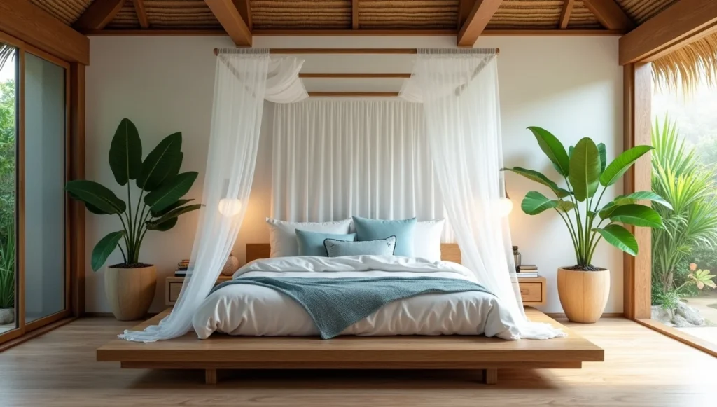 Platform beds are where it’s at for tropical bedrooms. Wood ones look amazing and they’re usually lower to the ground, which somehow makes everything feel more relaxed. Throw some mosquito netting around the bed – even if you don’t need it for actual mosquitos, it looks romantic as heck. Keep the bedding light and airy. White cotton, maybe some soft blue accents.