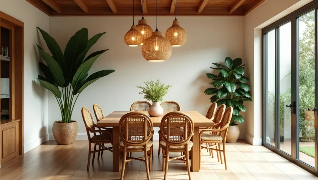 Nothing beats a solid wood table – teak if you can swing it, mango wood if you’re watching the budget. I love pairing these with wicker or rattan chairs. Feels casual but still put-together. Hang some pendant lights made from natural materials over the table. A big plant in the corner makes it feel like you’re eating outside, even when it’s freezing out there.