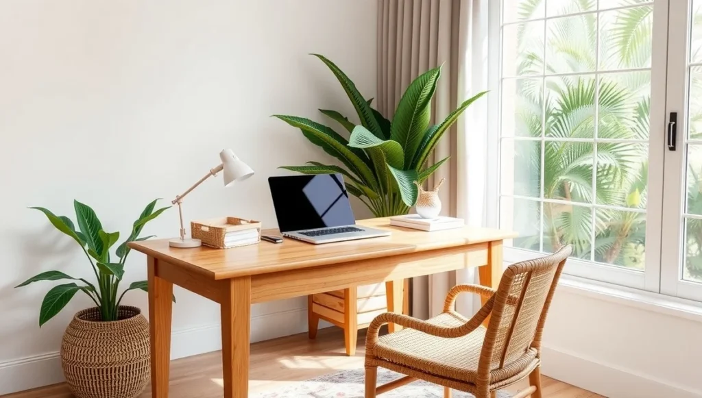 Working from home in paradise? Yes, please. Get yourself a solid wood desk – doesn’t have to be fancy, just real wood – and a decent rattan chair that won’t kill your back. Position everything near a window if you can. Natural light makes such a difference, plus your plants will be happier. Speaking of plants, they actually do help you focus better. Something about cleaner air, I think. Bamboo desk organizers keep your stuff tidy without looking too corporate.