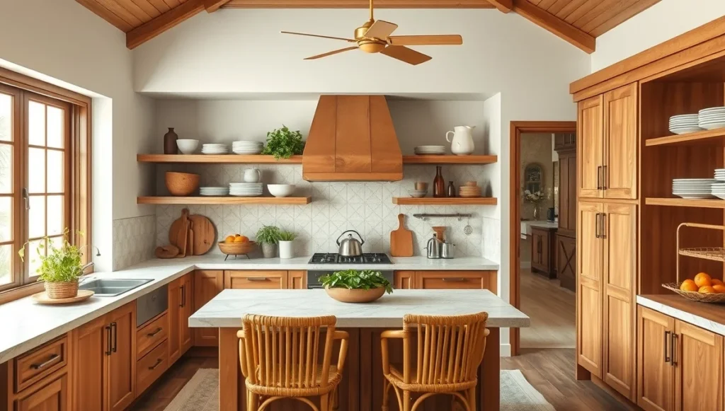 Ditch some of those upper cabinets and go with open wood shelving instead. Shows off your pretty dishes and makes the whole space feel less boxed in. Bamboo bar stools work great at an island – people can grab breakfast there or just hang out while you’re cooking. For counters, I’m obsessed with natural stone right now. And definitely get some herbs growing on the windowsill. Basil, mint, whatever you actually use. Looks good and you’ll use it.