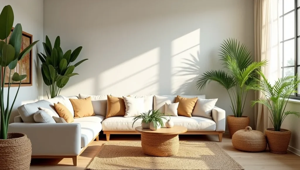 I always start with a good neutral base – think linen sectional or cotton sofa in cream or soft tan. Then I add personality through the fun stuff. A chunky jute rug anchors everything, and those woven storage baskets are both practical and pretty. Keep the furniture low and comfortable. You want people to sink in and relax, not sit up straight like they’re in a boardroom.