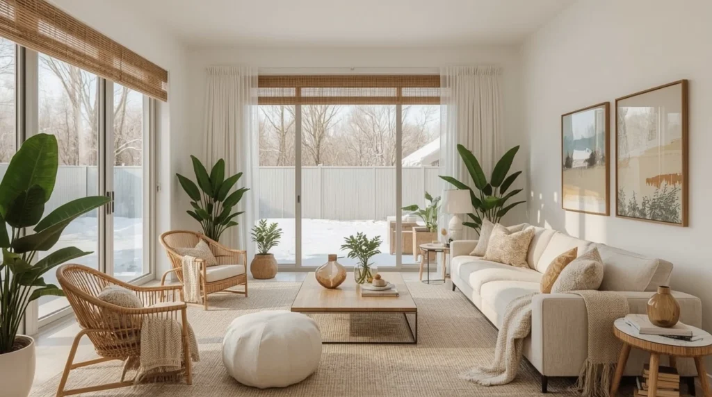 You want texture everywhere – jute rugs, seagrass baskets, raw wood tables. The trick is layering different materials without making everything look busy. Each piece should feel like it belongs in nature.