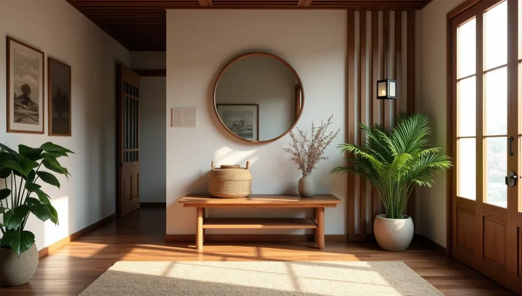 Mirror positioned to reflect natural light (but never directly facing your front door) makes small spaces feel bigger. Fresh plants welcome people and bring good energy to the transition zone.
