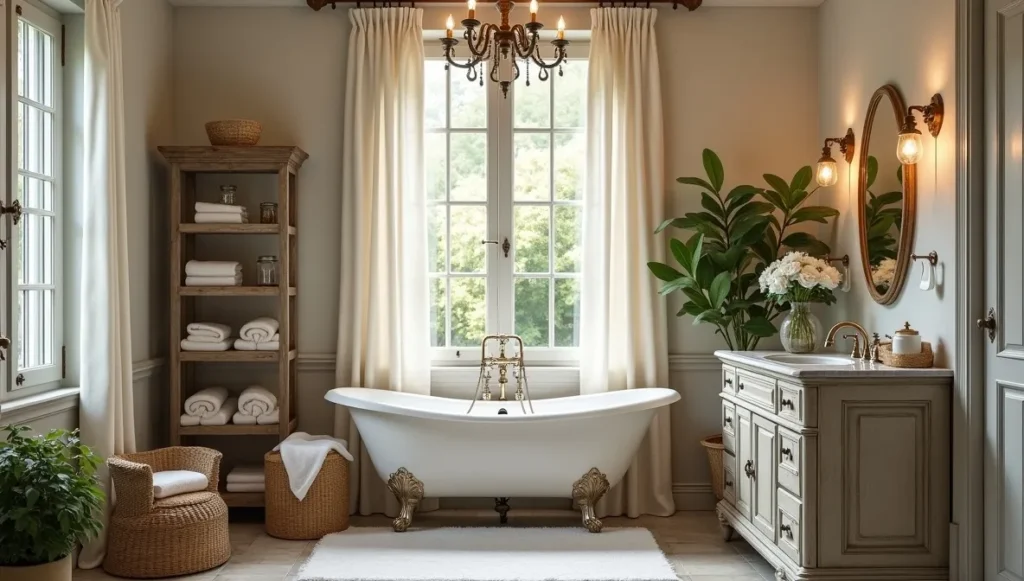 Who says bathrooms have to be boring? I’ve done some French Country bathrooms that are honestly nicer than most people’s living rooms. Clawfoot tubs, old-fashioned sinks that look like furniture, maybe some weathered wood shelving.