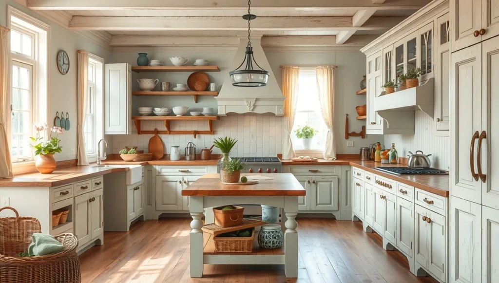 The cabinets should look like furniture, not kitchen cabinets. I paint them in soft colors, rough them up a little bit, and put on hardware that feels substantial in your hand. The whole point is making it look like someone’s great-grandmother’s kitchen, not something that rolled off a factory line.