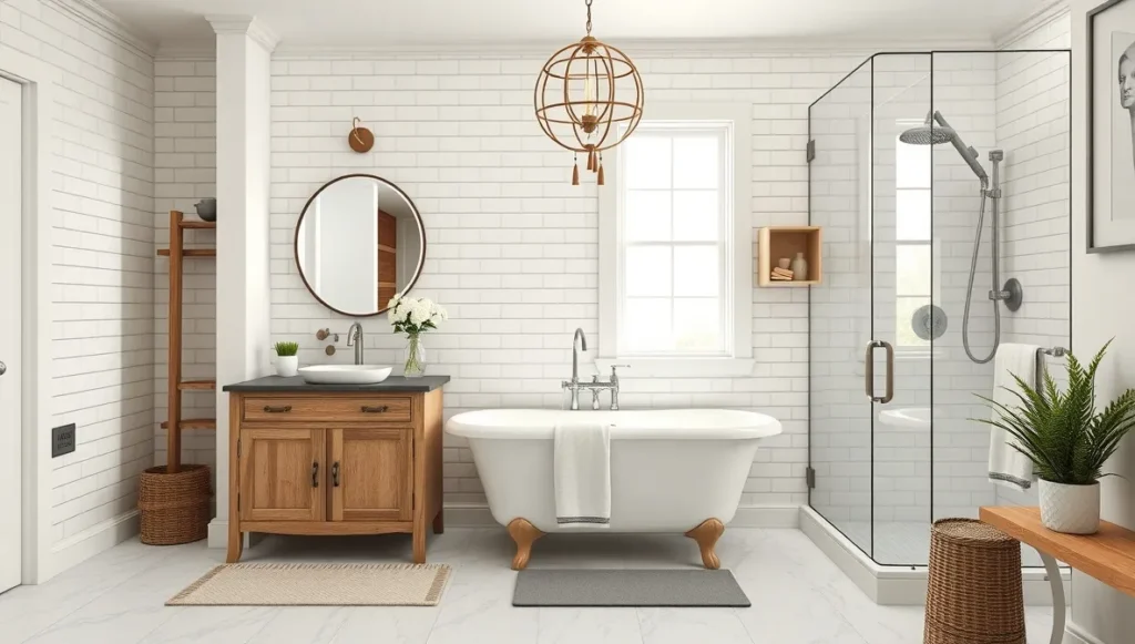 Vanities present big opportunities. Repurposed vintage furniture looks incredible but check with your plumber first – some antique pieces create expensive installation problems. Purpose-built vanities with farmhouse styling often work better practically.