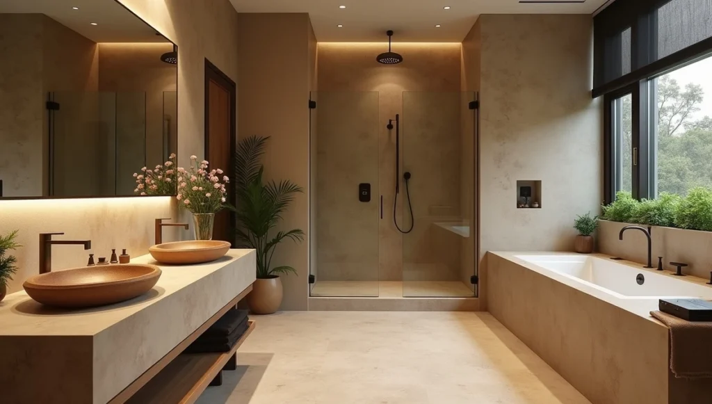 Indian bathrooms can be absolutely luxurious when designed thoughtfully. Natural stone surfaces feel cool under bare feet, and brass fixtures develop the most beautiful patina over time.