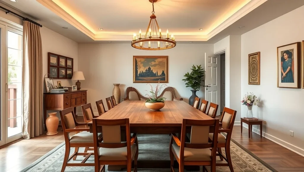 The dining room in a modern Indian home isn’t just about eating – it’s about connection. A solid wood table works overtime here. It hosts birthday parties, homework sessions, festival preparations, and those long conversations that happen after dinner.