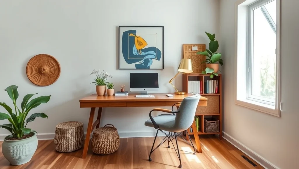 Natural wood desks age beautifully and handle daily use. I add traditional elements through accessories – maybe handwoven baskets for storage or a brass desk lamp that makes even spreadsheet work feel a little more special.