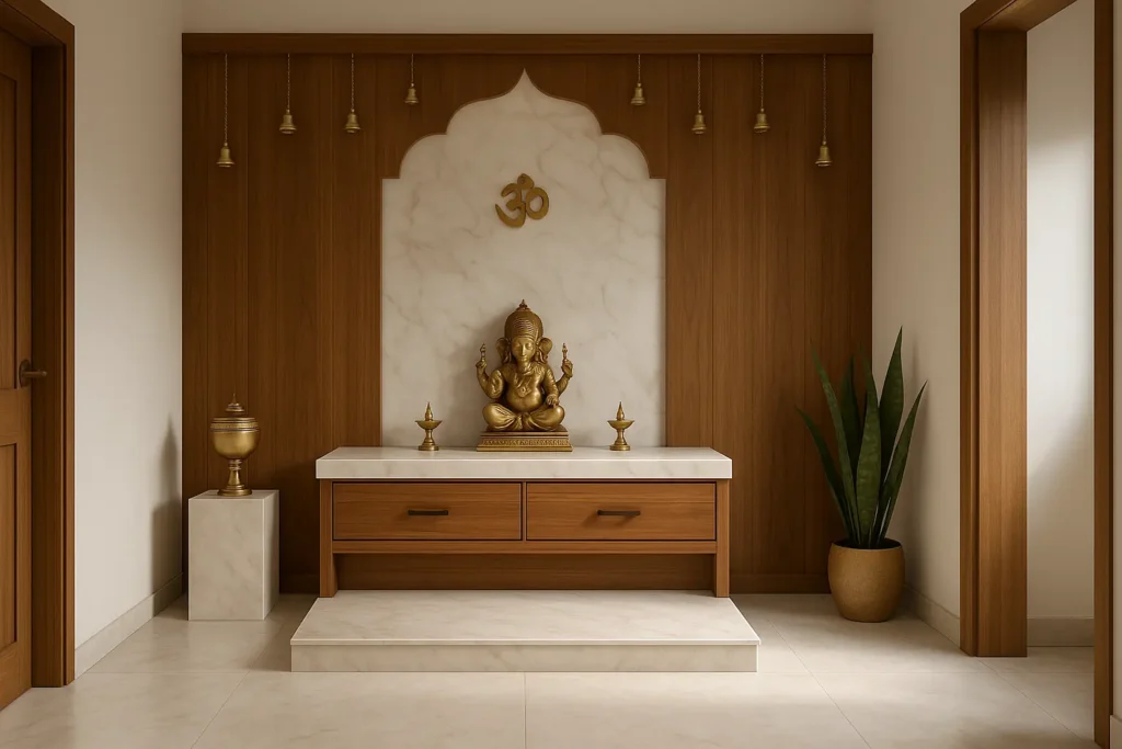 Pooja rooms, even in modern homes, should feel traditional and peaceful using natural materials like marble and wood.