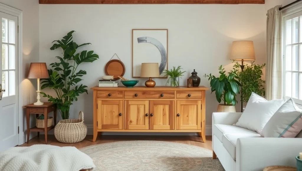 I’ve gotten pretty good at finding affordable natural options. Estate sales are gold mines for solid wood furniture that just needs some love. Even Ikea’s pine pieces work if you let them age naturally instead of trying to keep them looking new. Take a look at this simple yet beautiful sideboard.