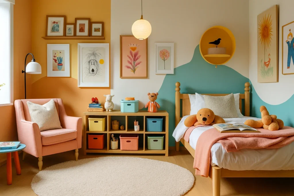 I create different zones for different activities. Reading corner gets the comfy vintage chair (painted with safe paint, obviously). Play area gets the colorful modern storage. And here’s something I always do – frame some of their artwork and hang it next to real art. Shows them their creativity matters just as much as the fancy stuff.