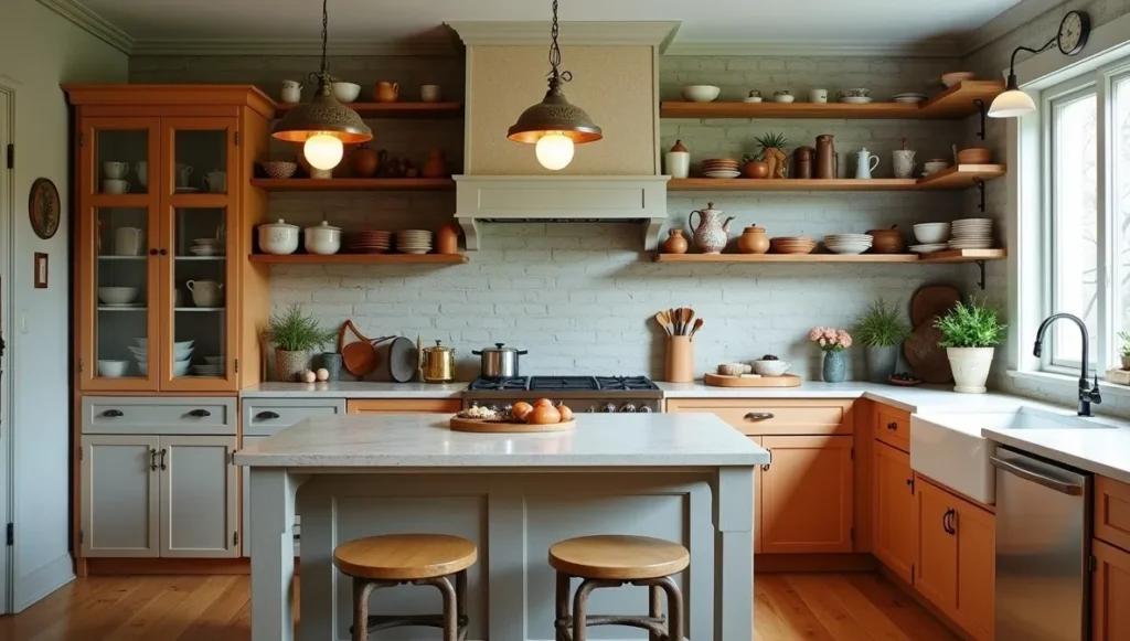 I love mixing cabinet styles – maybe keep your main cabinets simple and then add one vintage hutch or a funky island. Open shelves are perfect for showing off that pottery collection, but only put stuff up there that you actually use. Nothing worse than beautiful dishes covered in grease because they’re too close to the stove.
