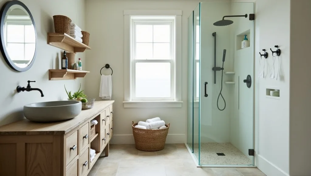 Install hooks everywhere for towels and robes. Add open shelving for pretty bottles and baskets. The goal is organized relaxation, not sterile perfection. A good shower with multiple heads and maybe a bench makes the space feel luxurious without being uptight about it.