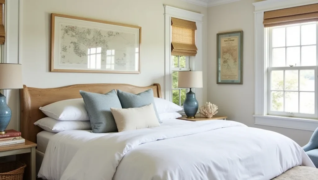 Master bedrooms get the luxury treatment, but approachable luxury. Layers of white linens that you can actually bleach when needed. A headboard that looks like driftwood but doesn’t give you splinters. I’m currently obsessed with vintage maritime prints for bedroom walls – not the obvious lighthouse stuff, but old nautical charts, faded photographs of harbors, maps with foxing around the edges.