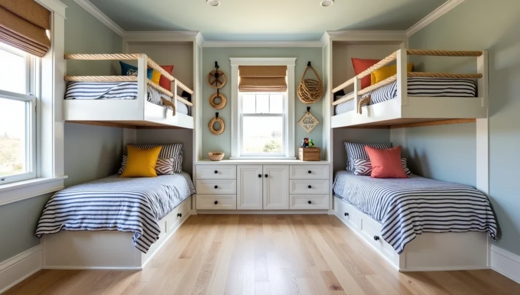 Navy and white stripes will never go out of style, but add some unexpected touches. Coral accents, sunny yellow pillows, maybe rope details that can handle enthusiastic play. Built-in bunks designed to look like ship berths make any kid feel like they’re on an adventure. Storage becomes part of the fun – wooden crates for treasures, nets for stuffed animals, hooks shaped like cleats for backpacks.