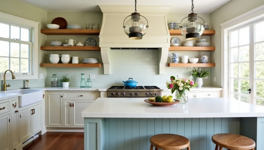 Open shelving everywhere possible. Display your everyday dishes – white ironstone, clear glass, maybe some blue and white pottery mixed in. Makes the space feel lived-in rather than staged. Islands need to multitask as breakfast bars, homework stations, cocktail prep areas, and places to dump grocery bags. Use materials that can handle spills and dings without anyone having a panic attack.