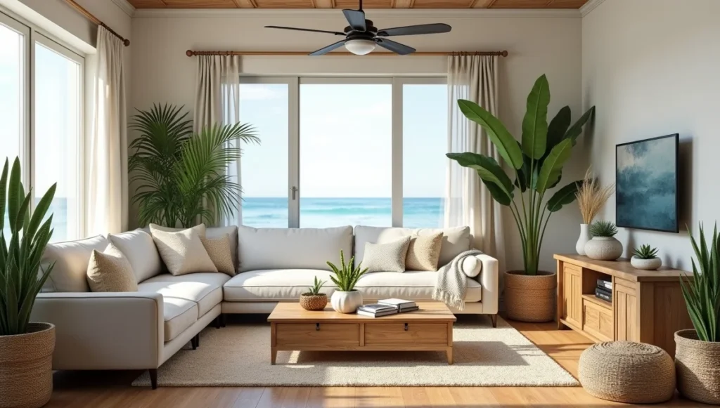 Plants matter more than most people realize. Not just any plants – ones that feel beachy. Snake plants with their architectural leaves. Palms that whisper in the breeze from ceiling fans. Succulents in weathered pots. They add life and movement that coastal spaces need.