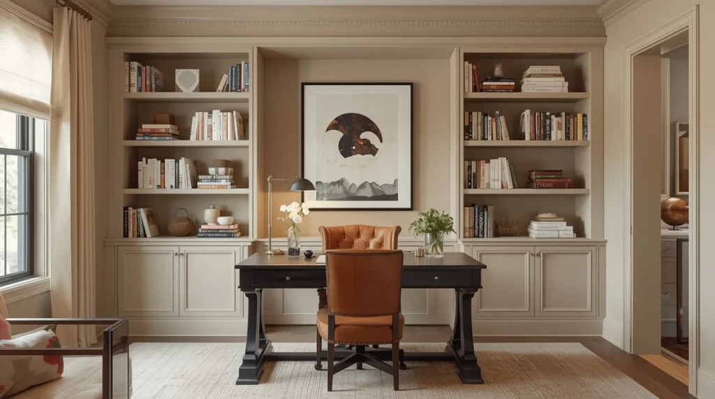 With everyone working from home these days, offices need to feel both professional and comfortable. Built-in bookshelves (traditional) with contemporary desk accessories. A classic leather chair with modern task lighting. The key is creating a space that works for Zoom calls but doesn’t feel corporate.