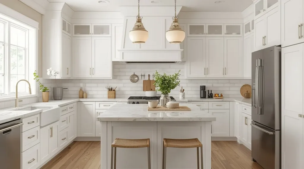 For countertops, quartz has become really popular, and for good reason. It looks like stone but doesn’t stain or scratch as easily. Pair it with subway tile – another classic that never goes out of style – and you’ve got a kitchen that’ll look good for decades.