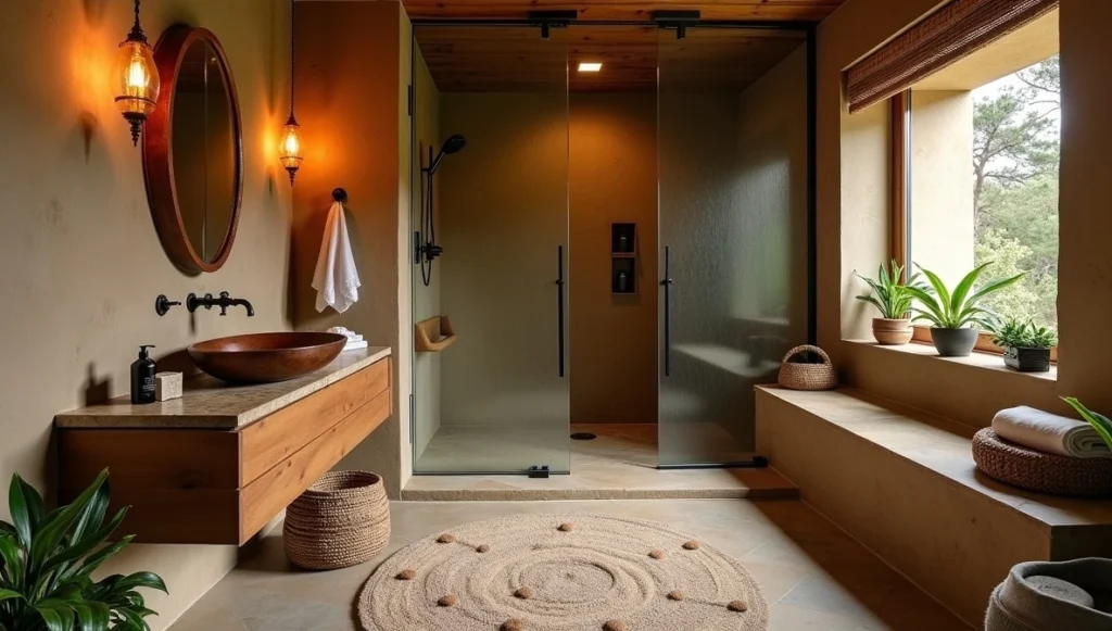 Tribal bathrooms channel those amazing natural hot springs you find in indigenous territories. Stone surfaces, wooden vanities, copper vessel sinks. River rock shower floors that massage your feet.