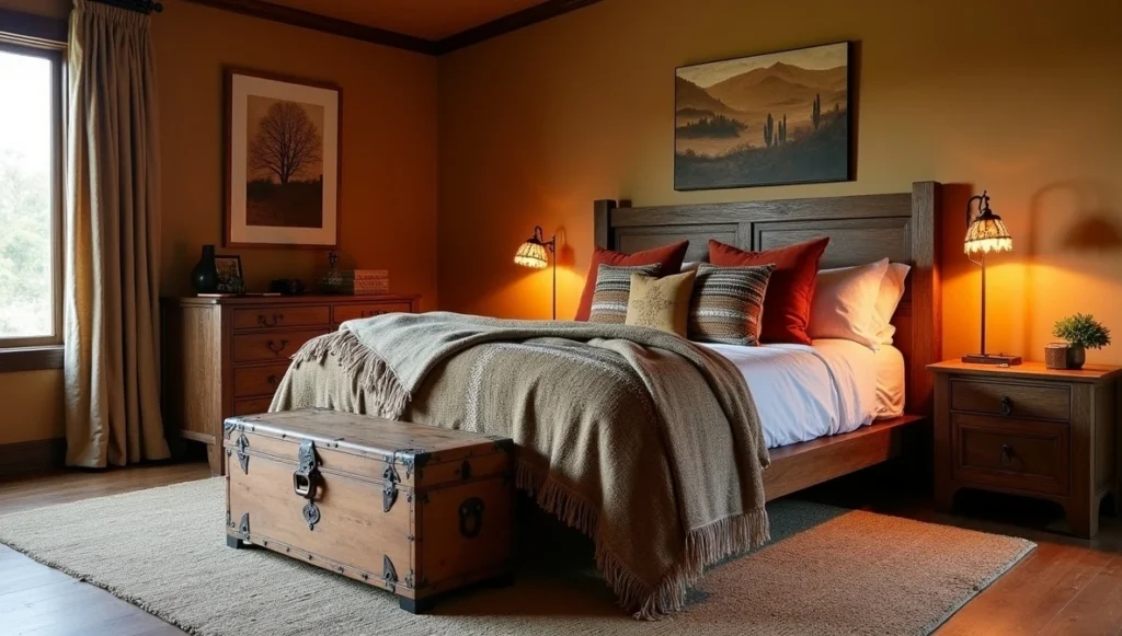 Tribal bedrooms work because they feel protected. Heavy wooden bed frames create a sense of shelter. I layer textiles like crazy here. Multiple blankets, throws, pillows in different textures and patterns. It’s like building a nest.