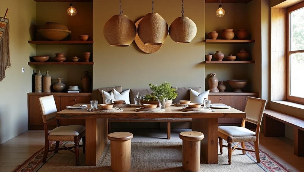 Tribal dining rooms understand that eating together is sacred. I start with solid wood slab tables that can handle real life, then mix seating heights – wooden benches with individual chairs and carved stools that float between spaces. Skip predictable chandeliers for Moroccan metalwork pendants or Ethiopian basket lights.