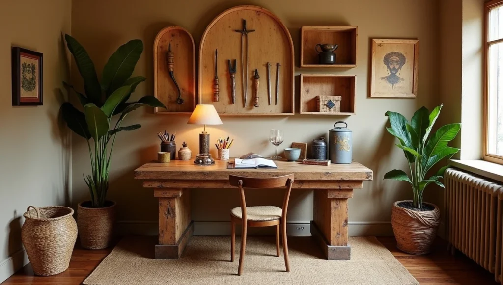 Use vintage market baskets for files, wooden crates for organizers, Ethiopian coffee containers for pens. Hang actual tools as art – hand-forged chisels, vintage weaving shuttles in shadow boxes. These remind you that creativity and craft go hand in hand.
