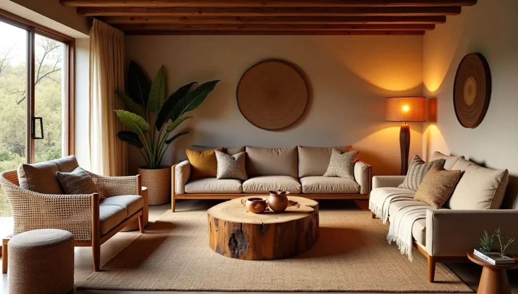 Forget the museum approach. Tribal living rooms should feel lived-in from day one. I arrange seating in conversation clusters, never in straight lines facing a TV. Coffee tables made from tree slabs anchor the space. Throws and pillows get tossed around and rearranged.