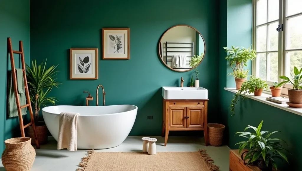 Small spaces can handle big color. I painted my bathroom walls this deep teal that my landlord probably hates but looks amazing with all my plants. Natural materials work great – bamboo stuff, wooden stools, jute rugs (just keep them away from the shower area).