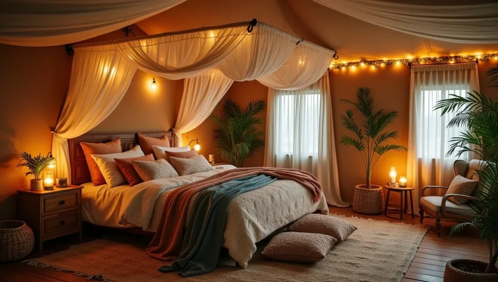 Boho bedrooms should feel like fancy camping. Cozy and private and like you never want to leave. Layer everything – sheets, quilts, throws, pillows in different sizes. I have so many pillows on my bed that making it every morning is basically a puzzle. Canopies are having a moment. You can hang curtains from the ceiling or just drape some fabric behind your headboard. Makes everything feel more romantic and less like a regular boring bedroom.