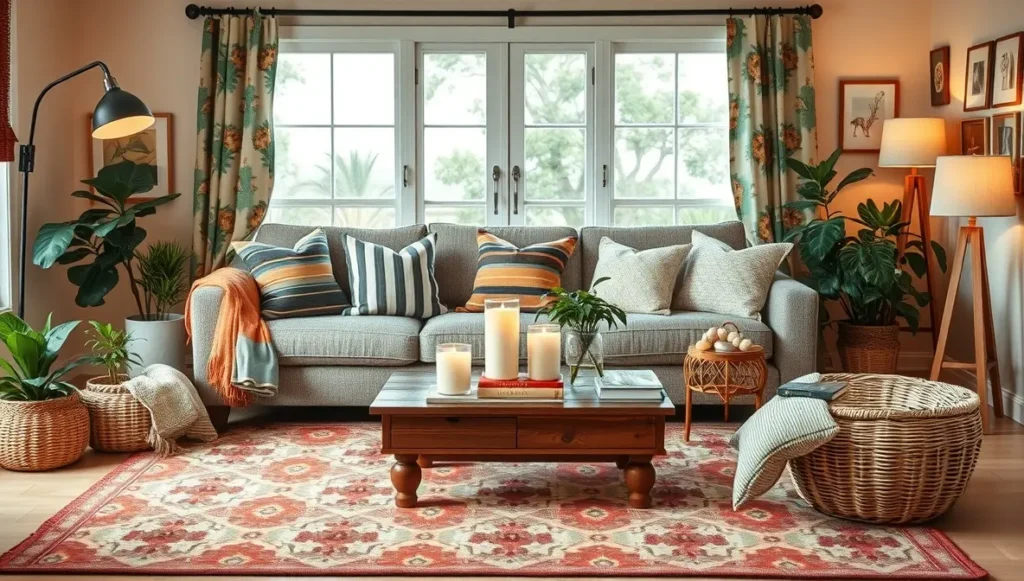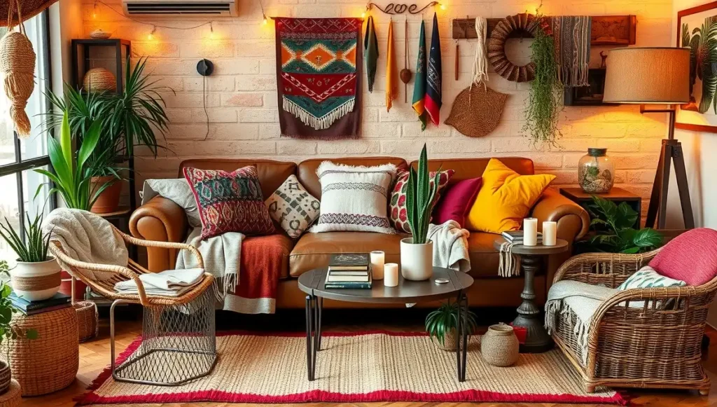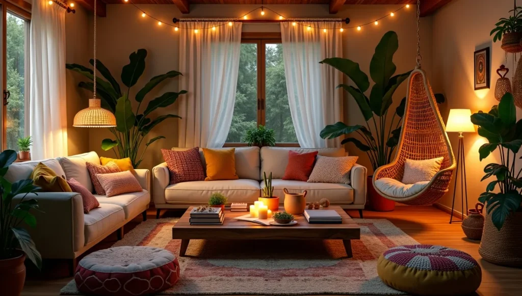 So Jenny texts me yesterday with this photo of her living room…and I mean, it looked like someone had exploded a textile store in there. Moroccan rugs everywhere, probably twenty throw pillows, plants taking over, some macrame thing dangling from who knows where. She’s like “Too much??” I immediately texted back: “Perfect. Add more plants.” Because honestly? That’s boho design. It’s messy and beautiful and somehow it all just… works.