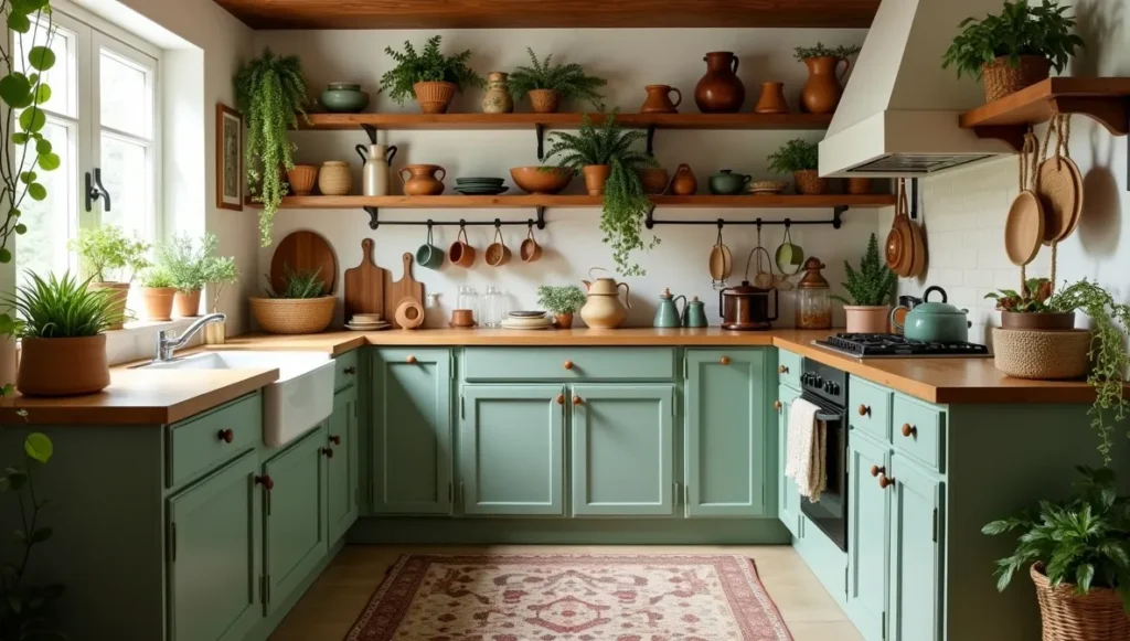 If you’re stuck with builder-grade cabinets like me, just paint them. I did mine in this sage green color and suddenly my kitchen had personality. Open shelving is great for showing off your pretty dishes. And plants everywhere – herbs on the windowsill, trailing plants on top of cabinets, whatever fits.