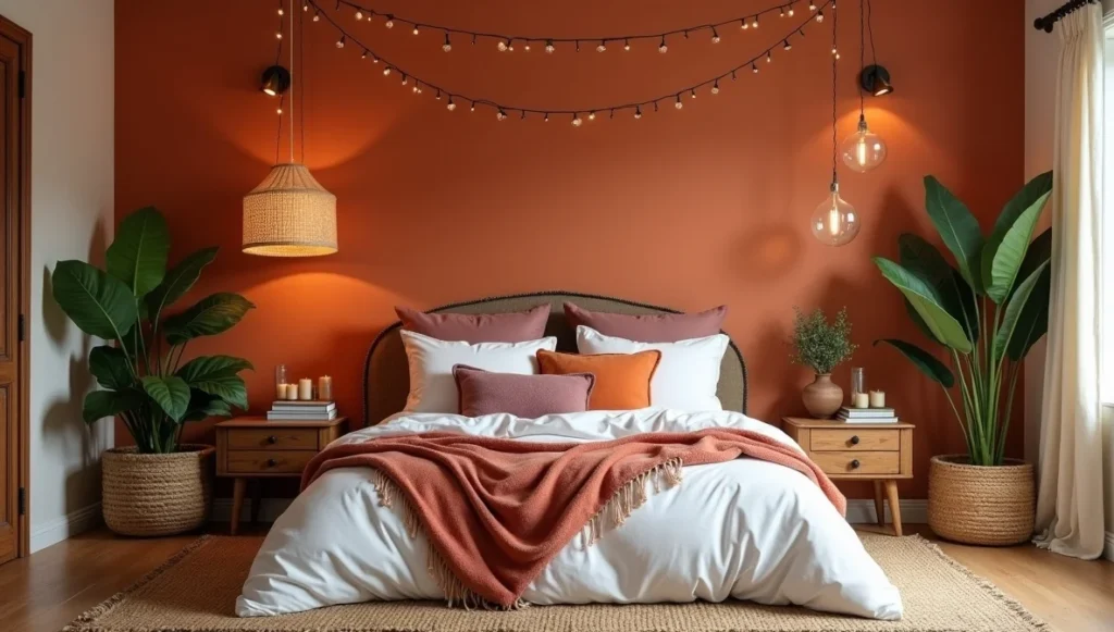 Here’s my approach to boho colors: if you can find it in nature somewhere, it probably works together. Think about sunsets – all those oranges and pinks and purples happening at once and nobody’s complaining about “clashing.” Or autumn forests with reds and yellows and browns all mixed up with greens. I painted my friend’s bedroom this terracotta color that honestly looked like baby food when I first rolled it on. Almost panicked and painted over it. But with white bedding and all my green plants? It’s like being hugged by the room.