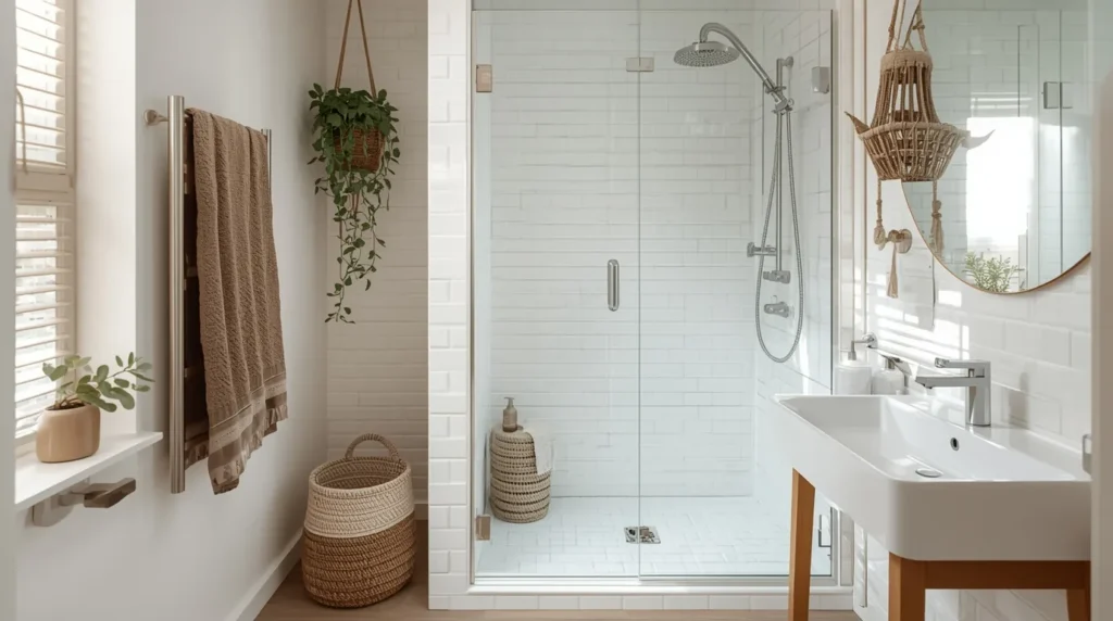 Woven baskets hide toiletries beautifully. Plants that handle humidity well – snake plants are nearly indestructible – add life to sterile spaces. Organic cotton towels in muted colors feel luxurious against skin.