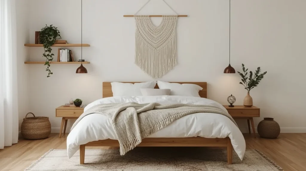 Bedrooms require restraint. Too many boho elements disrupt the serenity essential for good sleep. I always start with white or natural linen bedding – splurge here if your budget allows, because daily tactile pleasure matters.