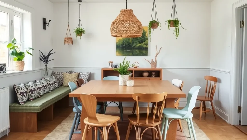 Statement lighting fixtures have big impact here. Woven pendants or even a series of hanging plants at varying heights above the table draw the eye upward and create intimate atmosphere.