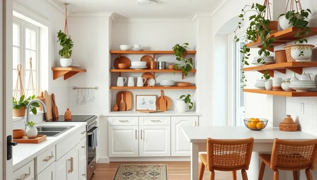 Mix white dishes with wooden cutting boards, woven baskets for storage, and pottery pieces in earthy tones. Hanging plants thrive in kitchen environments – herbs in macramé hangers near windows, trailing pothos above sinks where they catch indirect light.