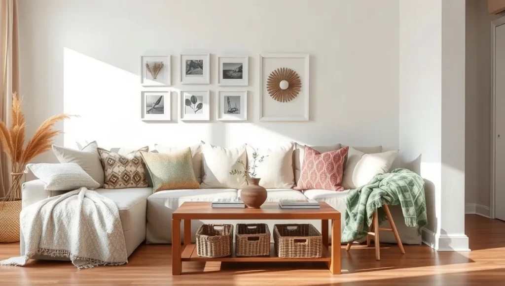 Storage should hide clutter while adding texture. Woven baskets or simple wooden boxes maintain the aesthetic while serving practical needs.