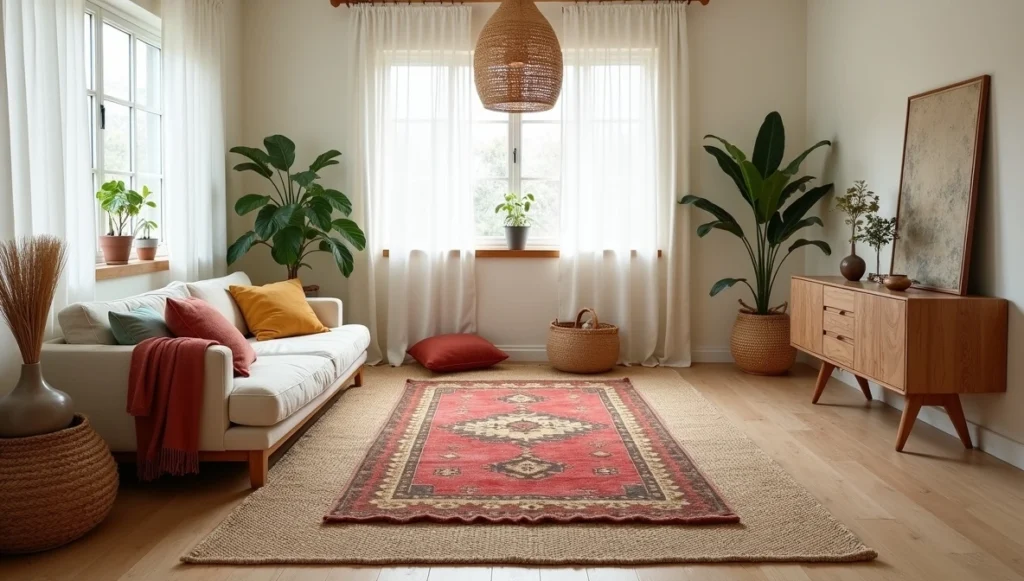 Smaller rugs become your playground. Persian runners, Moroccan boucherouite rugs, vintage kilims – these add the wanderlust element bohemian style craves. Just remember scale matters. Mix large patterns with smaller ones, geometric with organic.