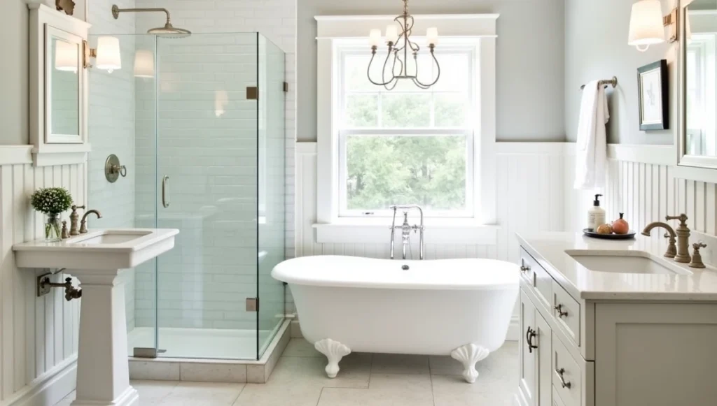Traditional bathrooms emphasize quality over trendiness. Pedestal sinks, classic faucets, substantial vanities – these create your foundation. Stick with one metal finish throughout. Mixing metals rarely looks intentional.