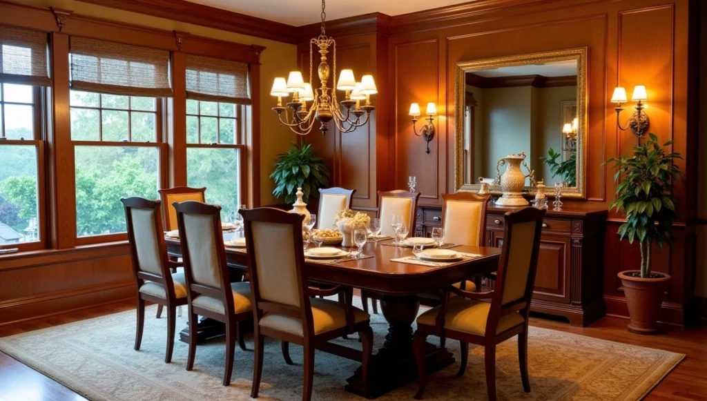 The table should feel substantial. Flimsy doesn’t work in traditional design. Solid wood in rich tones – that’s your foundation. Round tables work great in smaller spaces; rectangular ones suit more formal setups.