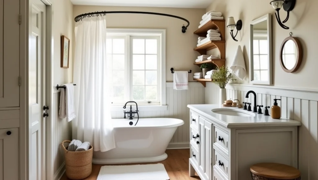 Farmhouse bathrooms start with a neutral palette and add warmth through materials. A vanity that looks like furniture – maybe an old dresser converted for plumbing – paired with a simple sink creates instant character.